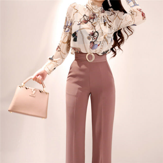 Be the first to review “Elegant Lady Tie Collar Flowers Blouse with Straight Long Pants”