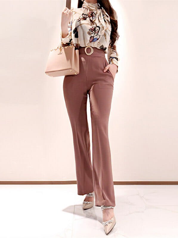Elegant Lady Tie Collar Flowers Blouse with Straight Long Pants 6