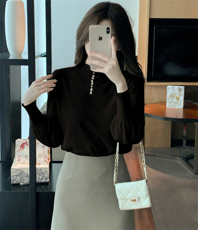 Fashion Korea 3 Colors Stand Collar Puff Sleeve Knitting T-shirt 7