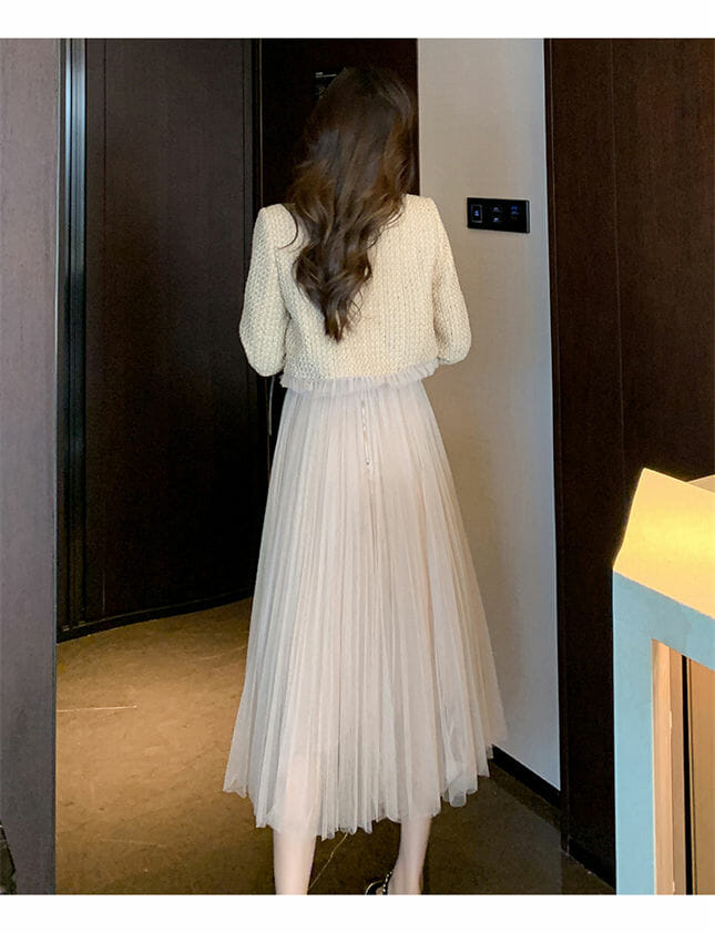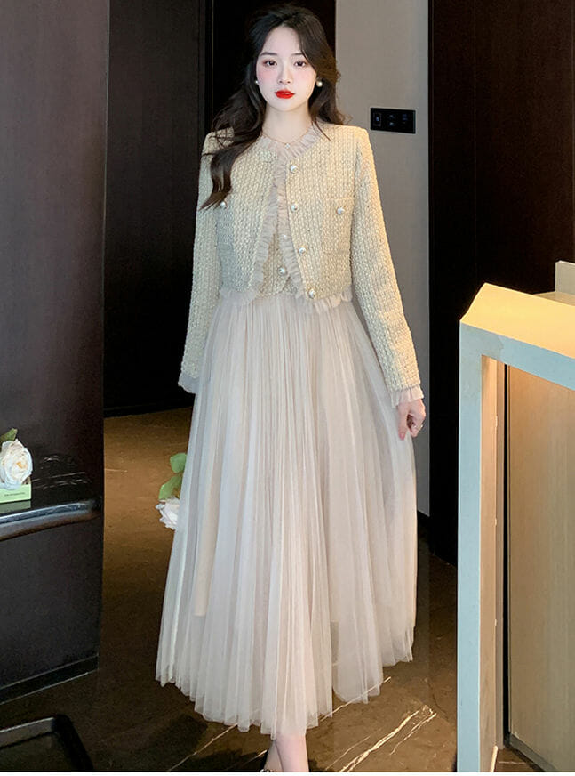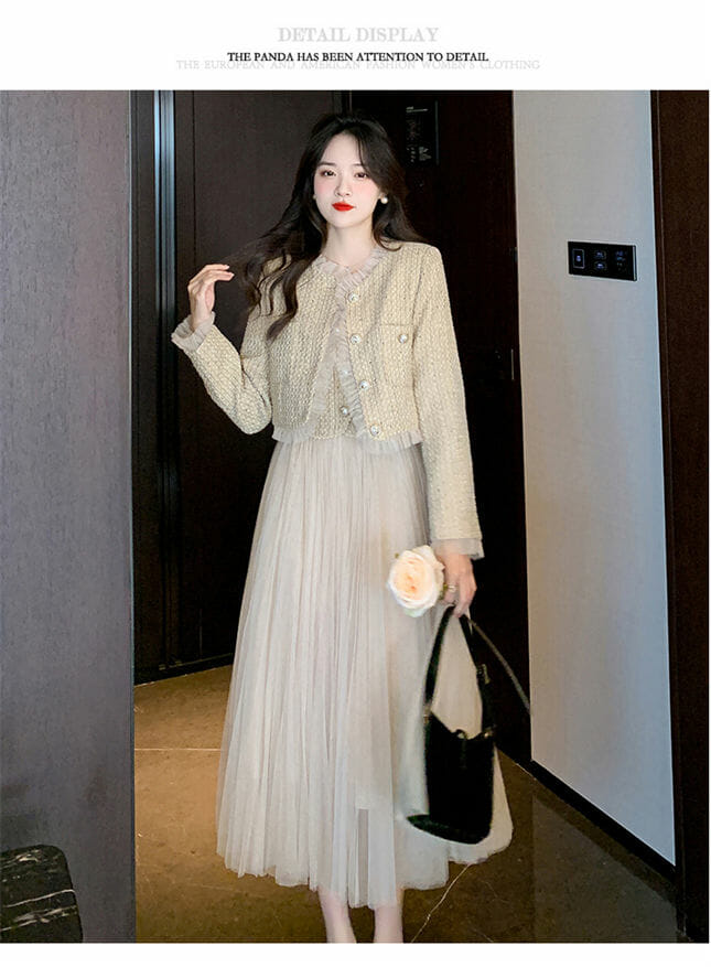Fashion Lady Tweed Jacket with Gauze Fluffy Straps A-line Dress 6