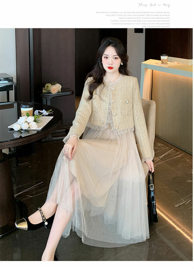 Be the first to review “Fashion Lady Tweed Jacket with Gauze Fluffy Straps A-line Dress”