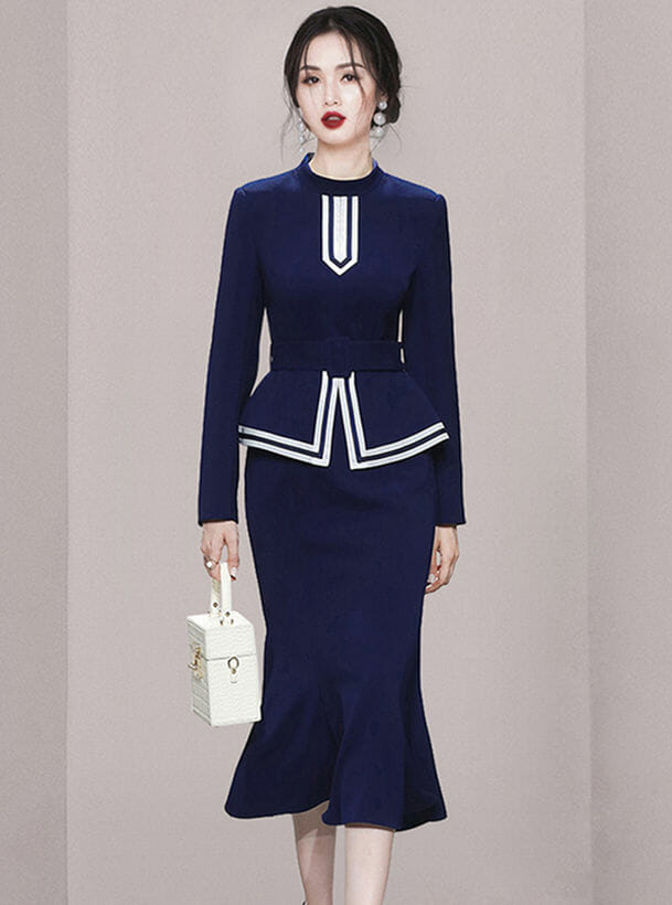 Fashion Women Belt Waist Color Block Fishtail Slim Dress Set