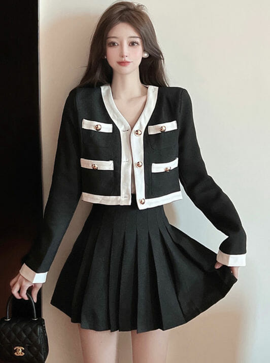 Grace Fashion Color Block Single-breasted Pleated Dress Set