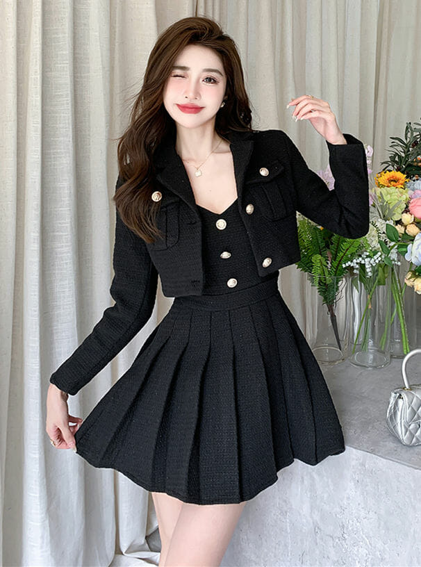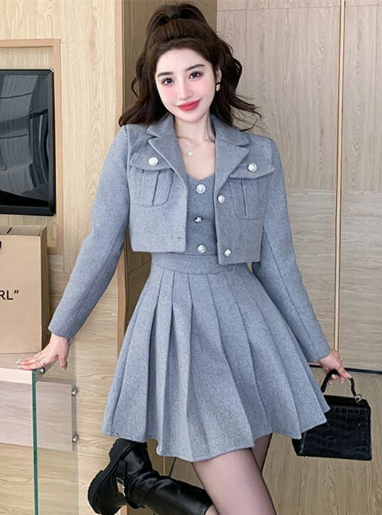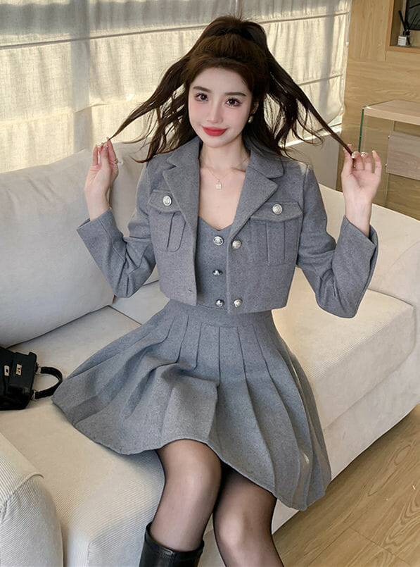 Be the first to review “Grace Lady 2 Colors Tailored Collar Jacket with Pleated Straps Dress”
