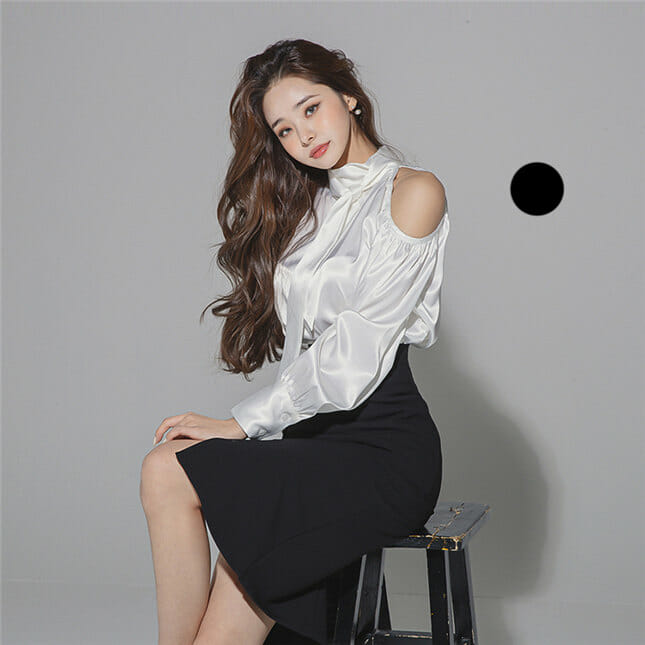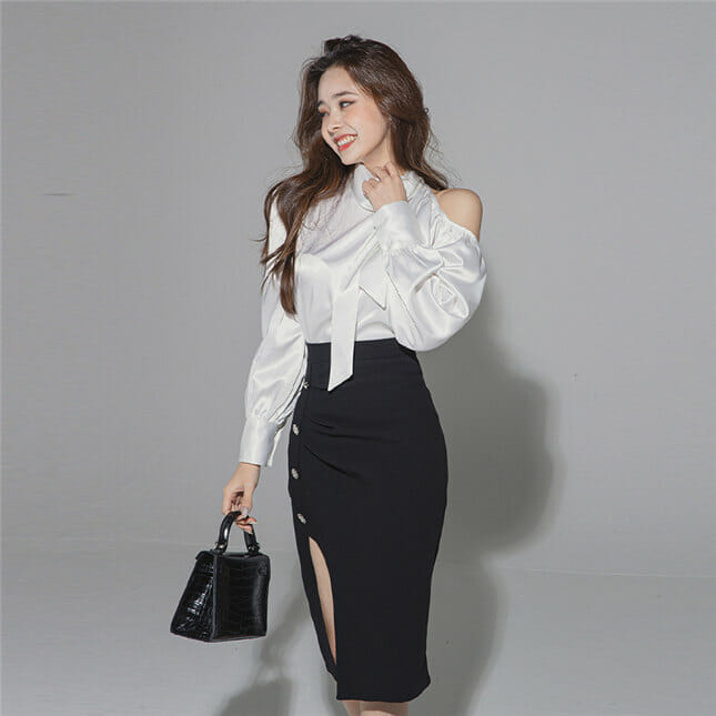 Grace OL Off Shoulder Tie Collar Blouse with Split Midi Skirt 7