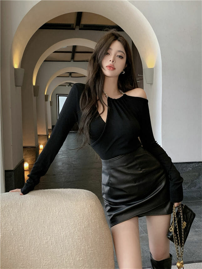 Be the first to review “Modern Lady 2 Colors Halter T-shirt with Slim Leather Skirt”