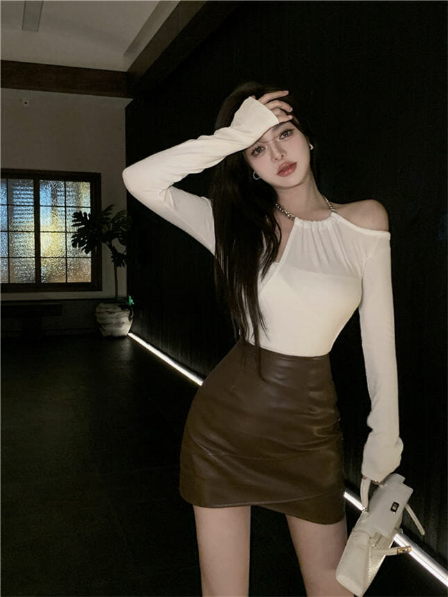 Modern Lady 2 Colors Halter T-shirt with Slim Leather Skirt 7