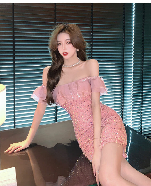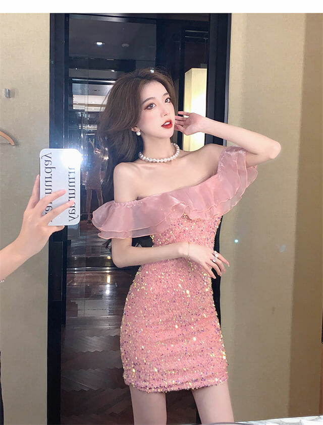Pretty Flouncing Boat Neck Sequins Short Dress