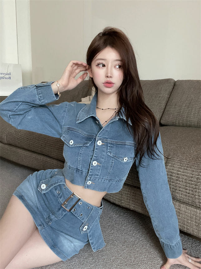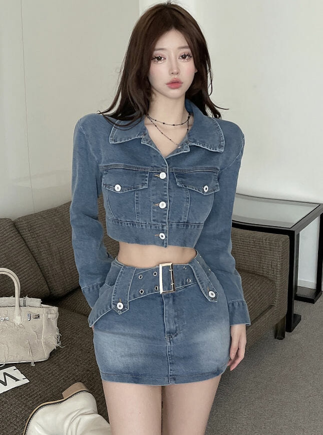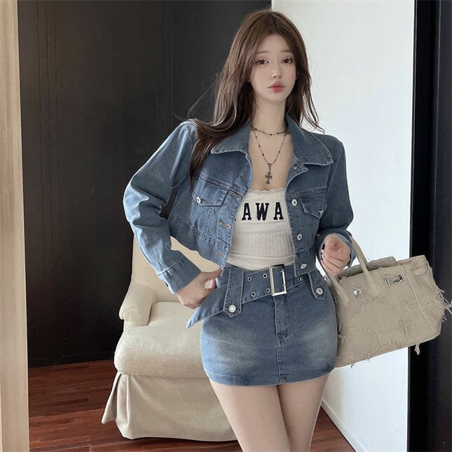 Retro Sexy Denim Short Jacket with Belt Waist Skinny Skirt 6