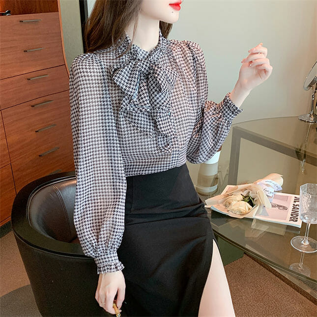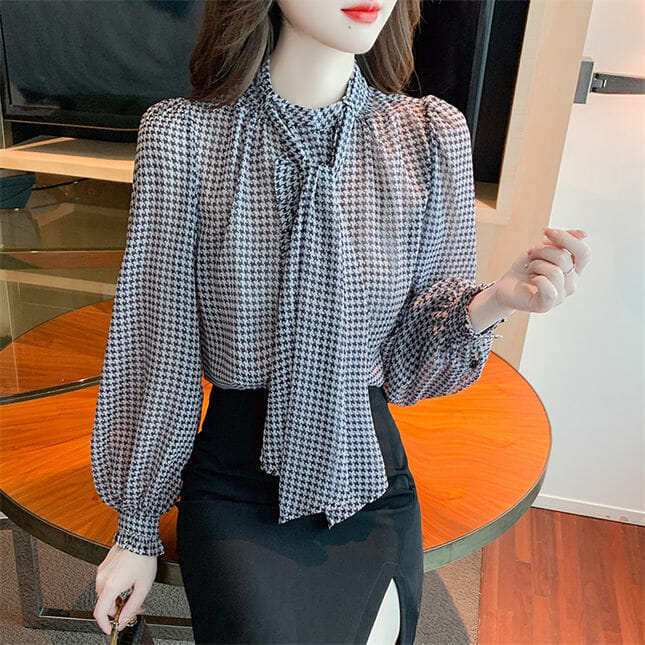 Retro Tie Collar Houndstooth Chiffon Blouse