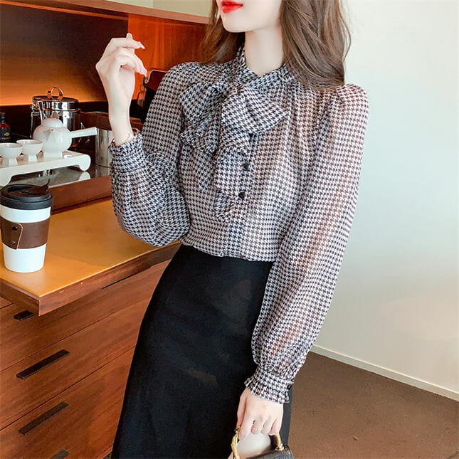 Be the first to review “Retro Tie Collar Houndstooth Chiffon Blouse”