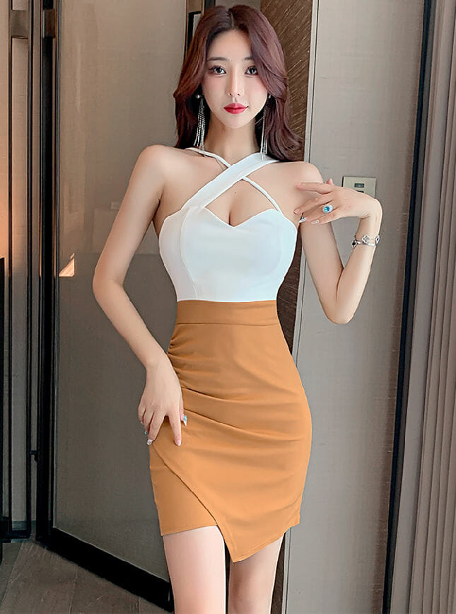 Sexy Korea 2 Colors Block Backless Straps Slim Dress