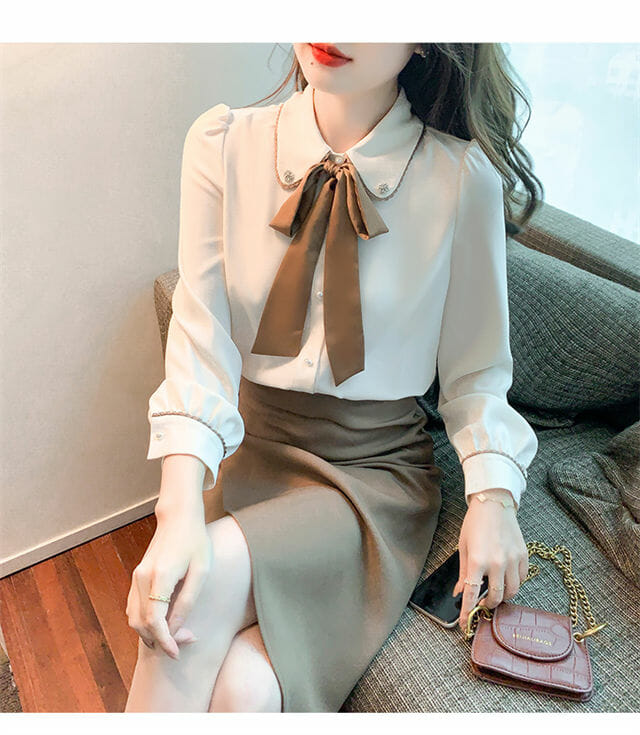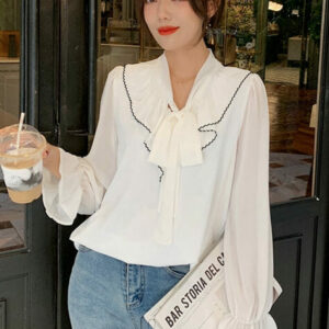 Spring New 2 Colors Flouncing Tie Collar Chiffon Blouse