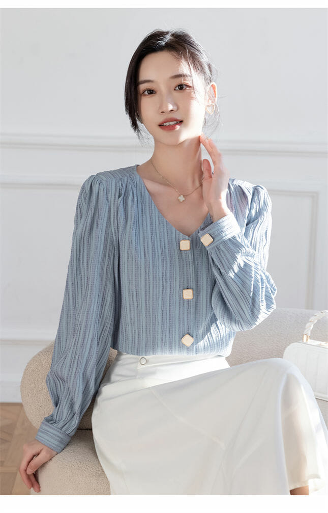 Spring New Arrive Buttons V-neck Stripes Casual Blouse