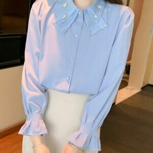 Spring New Beads Rhinestones Doll Collar Flare Sleeve Blouse