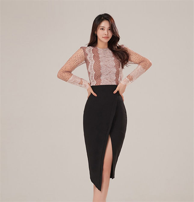 Spring New Dots Lace Slim Blouse with Split Midi Skirt