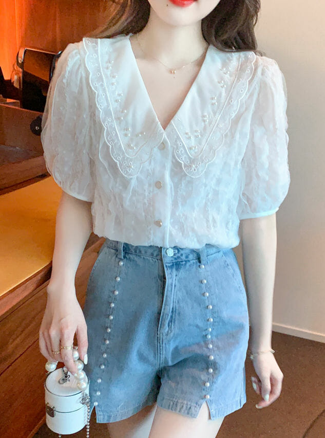 Fresh Girls Beads Doll Collar Lace Embroidery Puff Sleeve Blouse