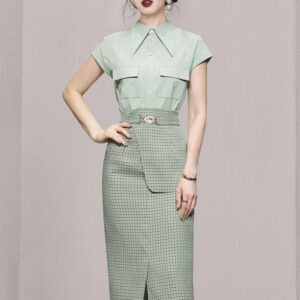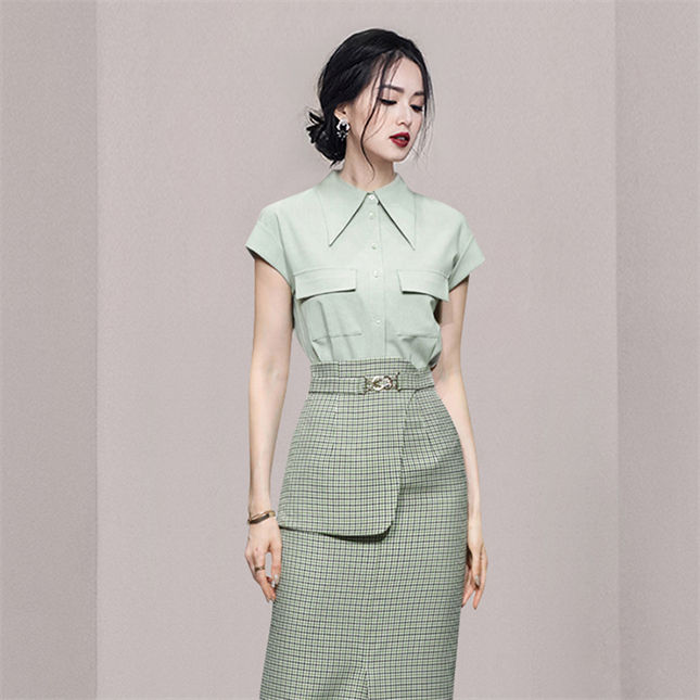 Grace Women Shirt Collar Blouse with Plaids Split Midi Skirt