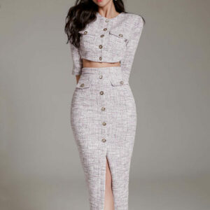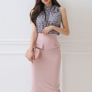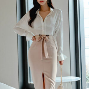 Grace Women Tie Collar Blouse with Split Midi Skirt