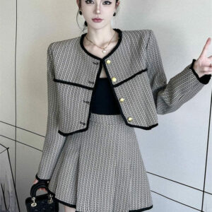 Grace Women Single-breasted Plaids Short Coat with Pleated Skirt