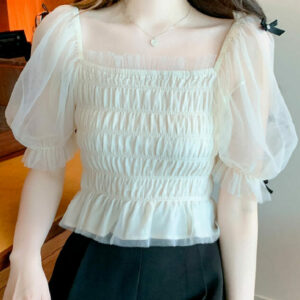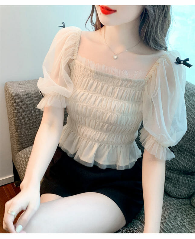 Grace Women Square Collar Bowknot Puff Sleeve Blouse