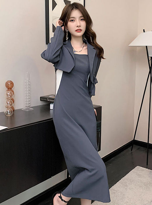 Grace Women Tailored Collar Jacket with Straps Slim Dress
