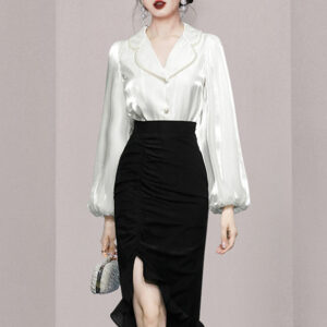 Grace Women Tailored Collar Puff Sleeve Blouse with Fishtail Skirt