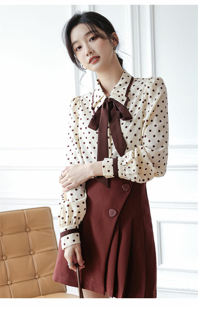 Grace Women Tie Bowknot Doll Collar Dots Loosen Blouse
