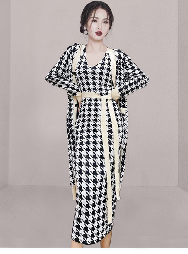 Hot Sell V-neck Tie Waist Houndstooth Knitting Dress Set