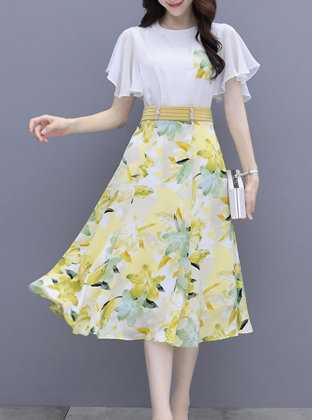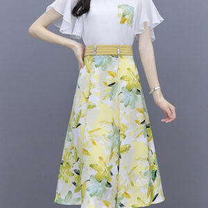 Hot Selling 3 Colors Chiffon Blouse with Flowers A-line Skirt
