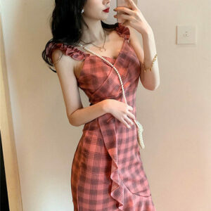 Hot Selling Fitted Waist Plaids Fishtail Straps Dress