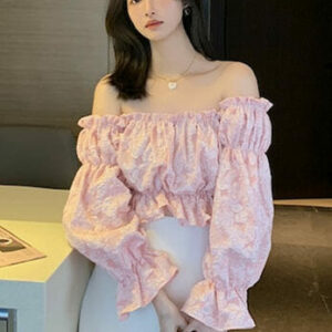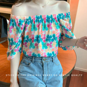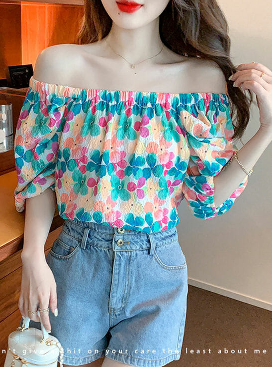 Lovely Boat Neck Flowers Puff Sleeve Blouse