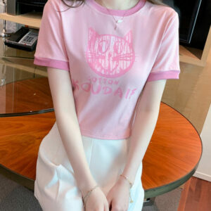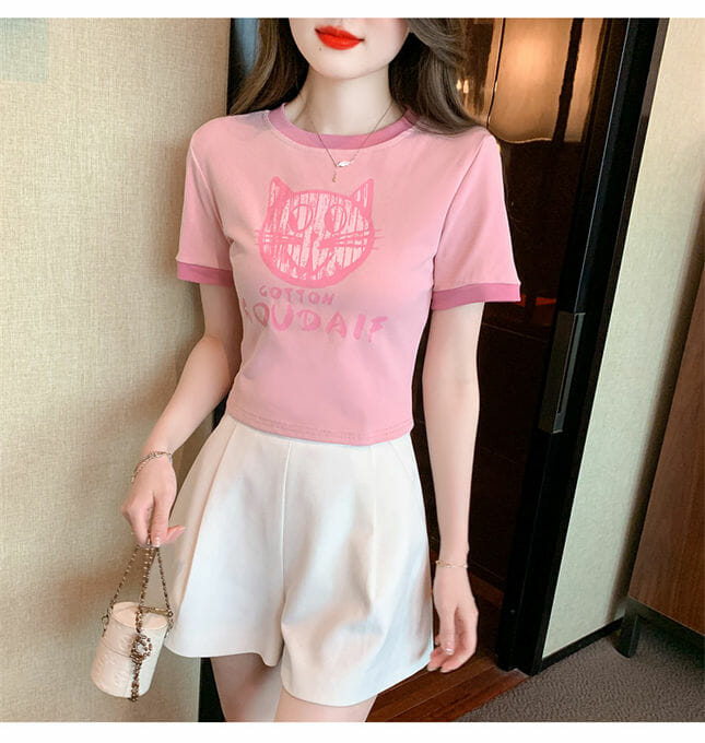 Lovely 2 Colors Cat Printings Cotton T-shirts