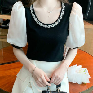 Lovely 2 Colors Rhinestones Collar Puff Sleeve Blouse