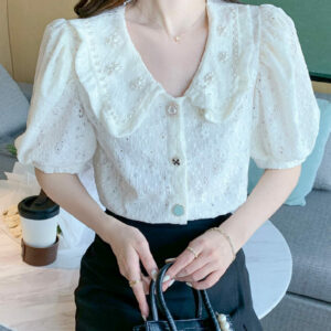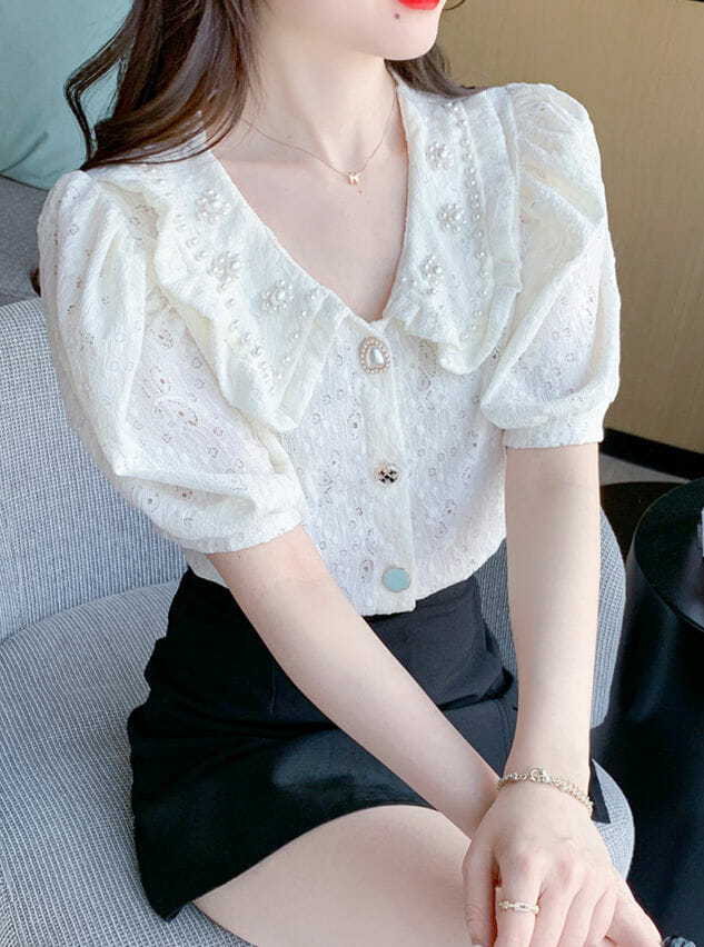 Lovely Beads Doll Collar Puff Sleeve Lace Blouse
