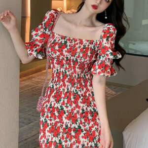 Lovely Boat Neck Flowers Pleated Puff Sleeve Dress