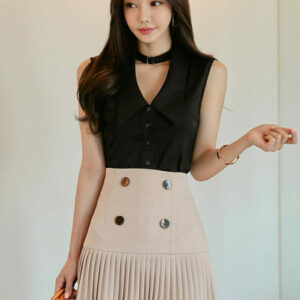 Modern Lady Doll Collar Blouse with Double-breasted Pleated Skirt