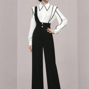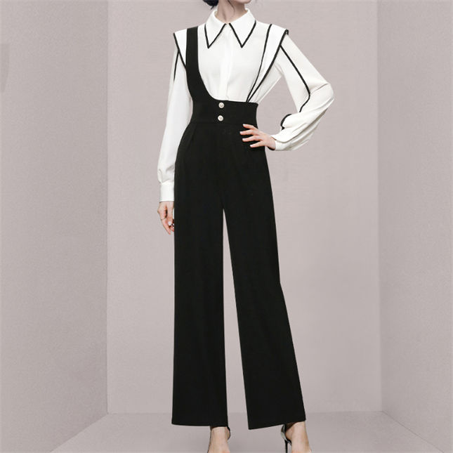 Modern Lady Doll Collar Blouse with High Waist Straps Jumpsuits