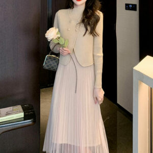 Modern Lady Double-breasted Coat with Pleated Knitting Dress